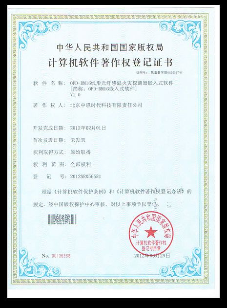 2012年6月29日,公司自主研发的OFD-DM16线型感温火灾探测器嵌入式软件获得中华人民共和国国家版权局颁发的计算机软件著作权登记证书。