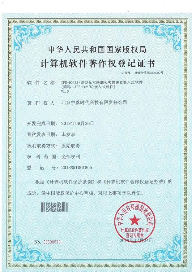 近日公司自主研发的新产品IFE-D02(S)线型光束感烟火灾探测器嵌入式软件、IFE-HD高清图像型火灾探测器嵌入式软件获得中华人民共和国国家版权局颁发的计算机软件著作权登记证书。标志着我公司自主知识产权又创佳绩,充分展示了我公司高效的自主研发能力和持续的自主创新能力。